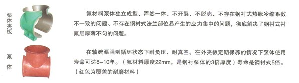 該泵采用特殊工藝烘熔、模壓而成,其中鋼襯復合泵泵體襯氟厚度10mm以上,夾板式泵泵體氟厚度25mm以上,并在氟內(nèi)壁上進行特殊處理。