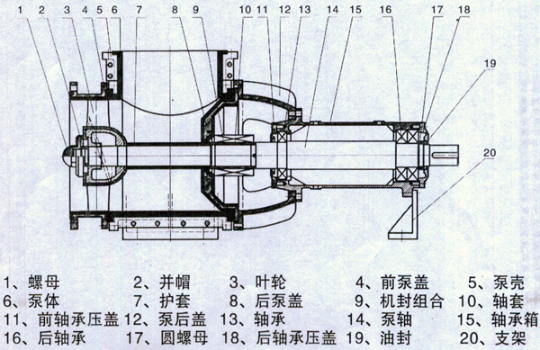 2、本泵采用后開門拉出式結(jié)構(gòu)泵,拆卸維修方便,檢修時可不拆卸聯(lián)接管路,變可將泵的軸子取出。